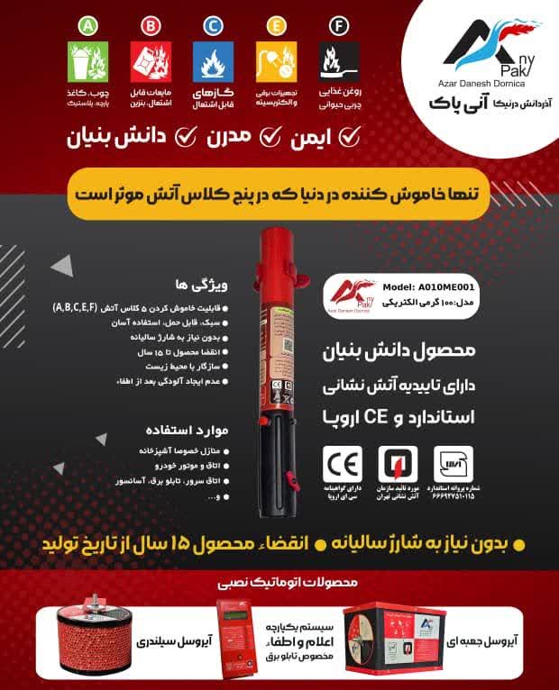 آتش خاموش کن دستی آنی پاک محصول شرکت دانش بنیان آذر دانش درنیکا با فرمولاسیون جدید آیروسل محصولی کاربردی و منحصر به فرد در زمینه اطفاء حریق می باشد.